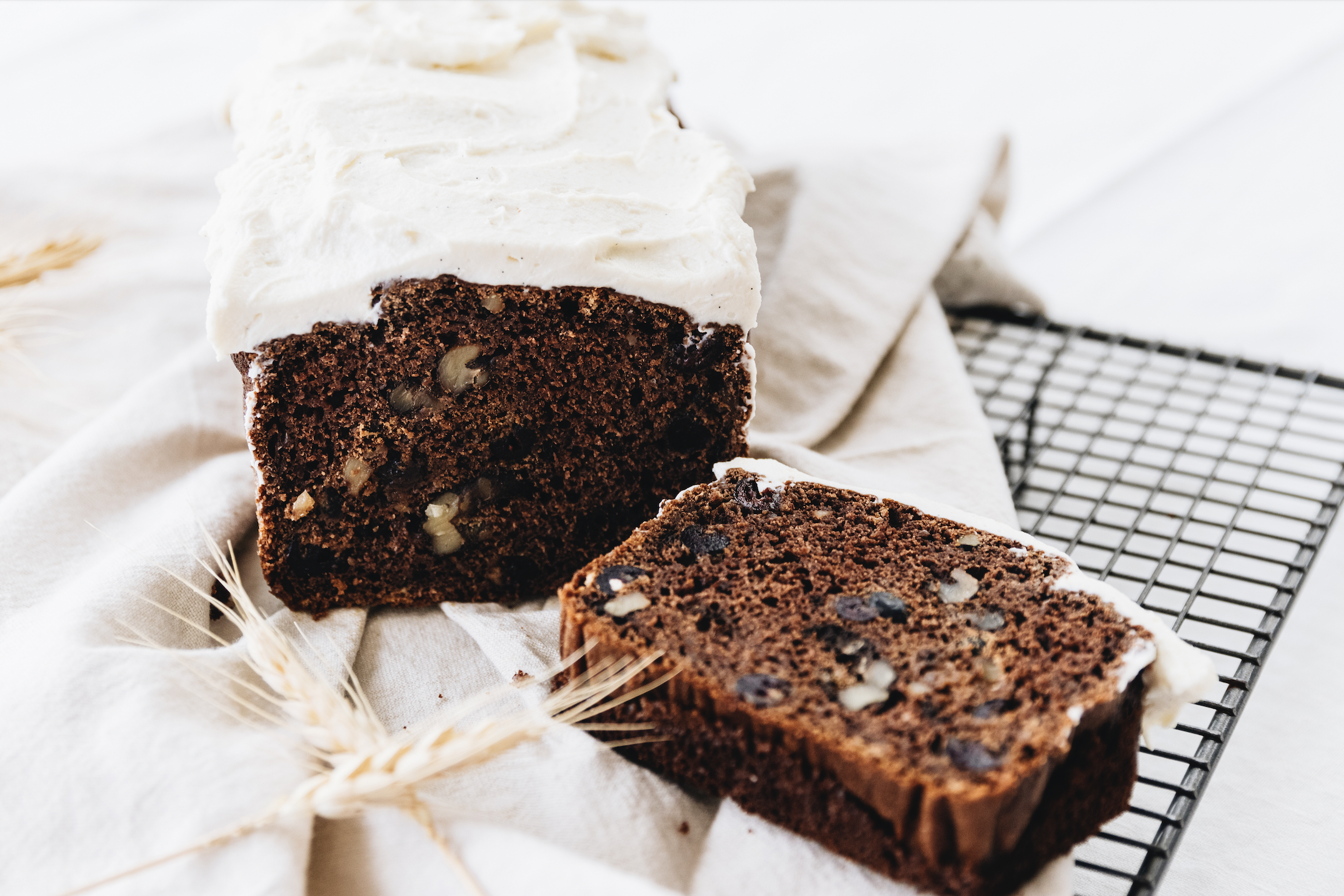 - Once the loaf is cooled, spoon a generous amount of ricotta icing on top and serve.